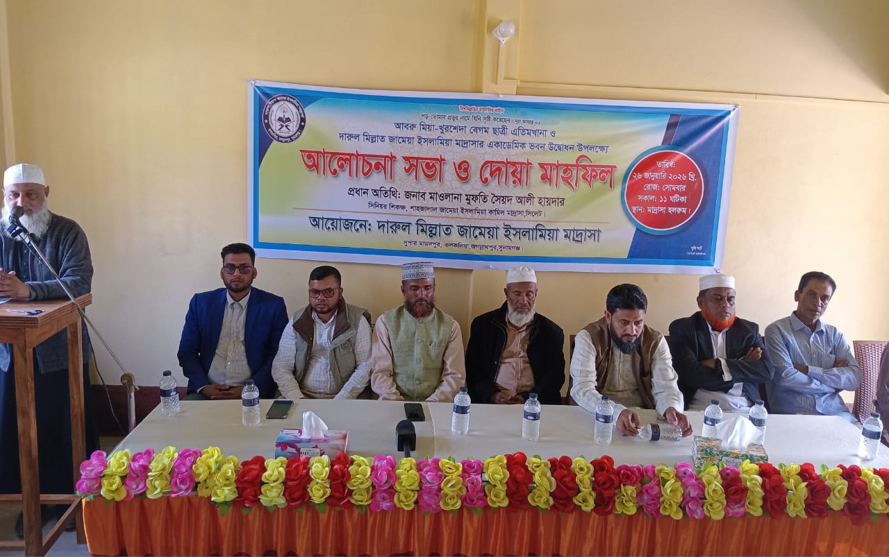 সুনামগঞ্জের জগন্নাথপুর উপজেলায় আবরু মিয়া–খুরশেদা বেগম ছাত্রী এতিমখানা ও দারুল মিল্লাত জামেয়া ইসলামিয়া মাদ্রাসার নবনির্মিত একাডেমিক ভবন উদ্বোধন উপলক্ষে আলোচনা সভা ও দোয়া মাহফিল অনুষ্ঠিত হয়েছে।