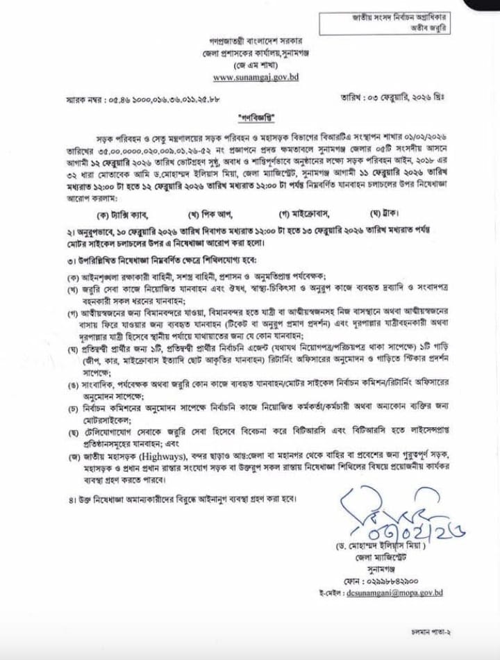 জেলা প্রশাসনের জারি করা এক বিজ্ঞপ্তিতে জানানো হয়, সড়ক পরিবহন ও সেতু মন্ত্রণালয়ের নির্দেশনা অনুযায়ী আগামী ১২ ফেব্রুয়ারি ২০২৬ রাত ১২টা থেকে ১৩ ফেব্রুয়ারি ২০২৬ রাত ১২টা পর্যন্ত সুনামগঞ্জ জেলার বিভিন্ন গুরুত্বপূর্ণ সড়কে কিছু যানবাহনের চলাচল সীমিত থাকবে।